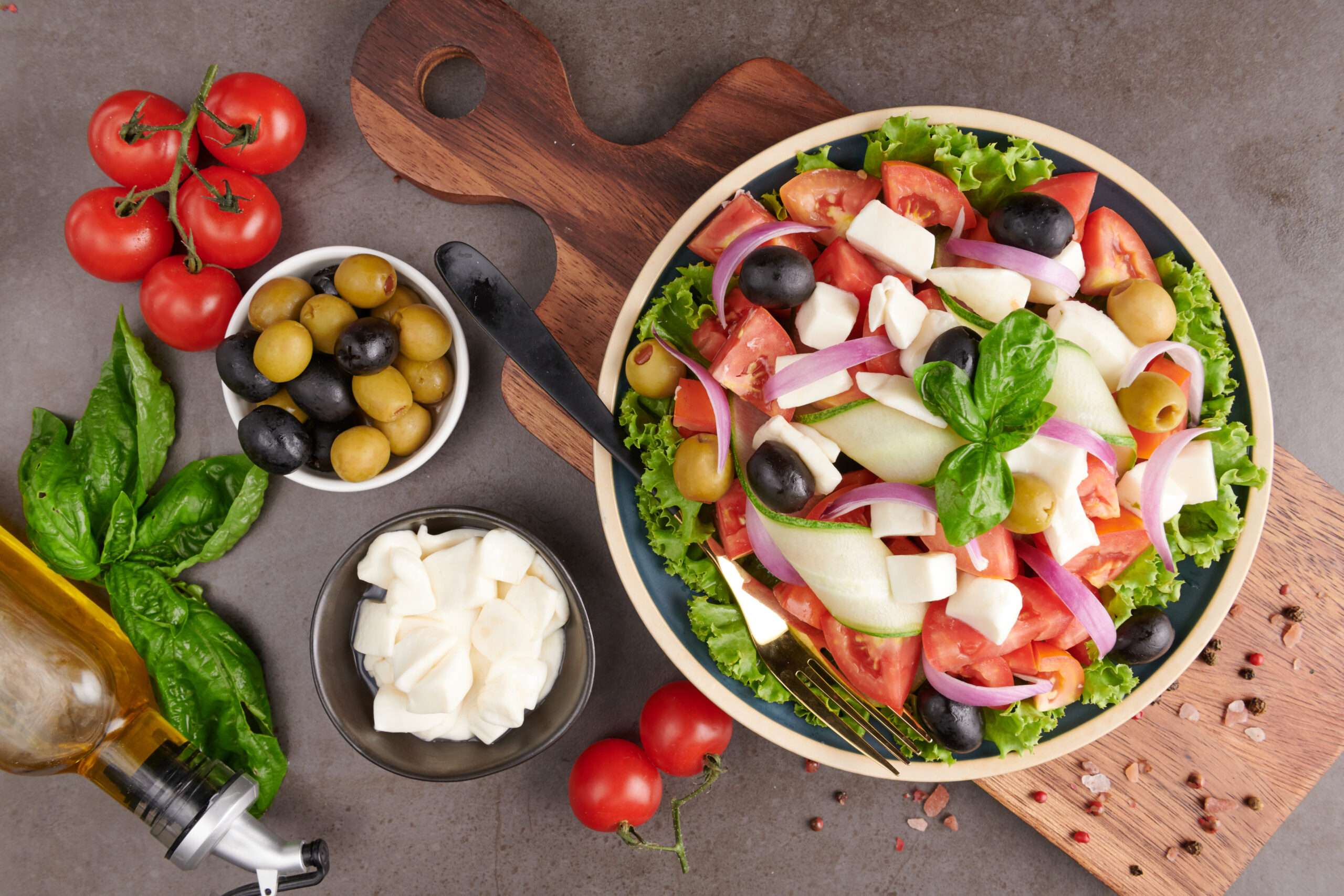 Lettuces, cucumber, capsicum, & Croutons dressed with lemon juice, olives, olive oil